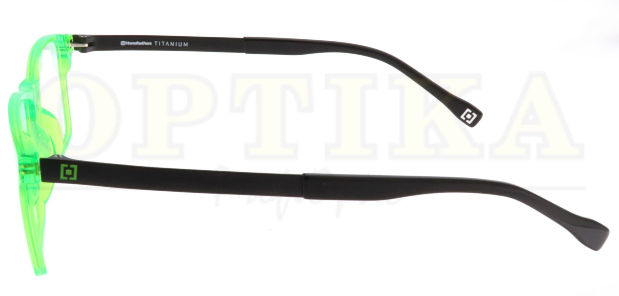 Barva plastové očnice je lesklá, poloprůhledná neonově zelená. Titanové stranice jsou matné černé.